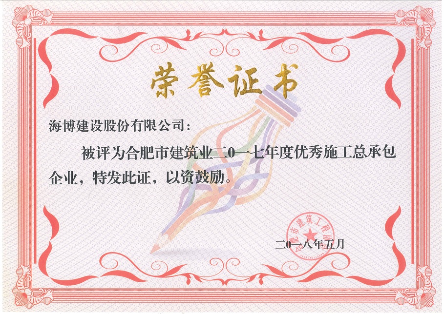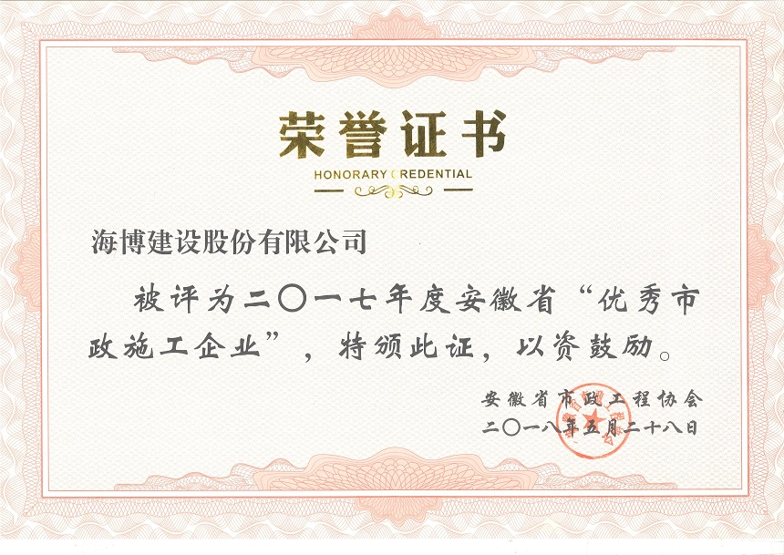 近日,安徽省市政工程協(xié)會發(fā)布了市政協(xié)會秘字【2018】06號文件,文件中表彰了2017年度“安徽省優(yōu)秀市政施工企業(yè)”和“安徽省市政施工企業(yè)優(yōu)秀建造師(項目經(jīng)理)”。經(jīng)過省市政工程協(xié)會專家評審委員會的層層評比...