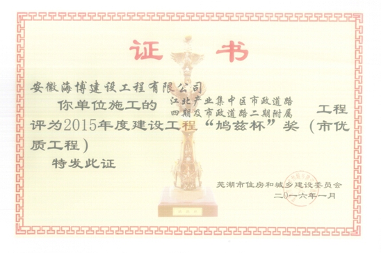 2016年2月2日,蕪湖市建筑業(yè)協(xié)會于市住建委大樓召開建筑業(yè)協(xié)會常務理事會暨工作交流會;會上,蕪湖市建委向榮獲2015年“鳩茲杯”獎的單位頒發(fā)了獲獎證書及獎杯,我單位承建的“江北產業(yè)集中區(qū)市政道路四...