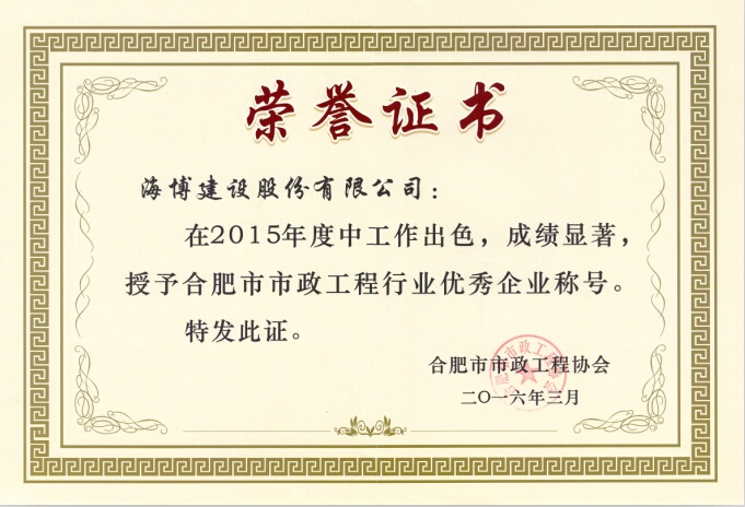 合肥市市政工程協(xié)會第三屆三次理事大會于昨日召開,會上對2015年度評選出的合肥市市政工程“優(yōu)秀企業(yè)”和“優(yōu)秀項目經理”進行表彰,海博建設股份有限公司榜上有名,并且我司李申鋒、郭劍兩位同志也榮獲...