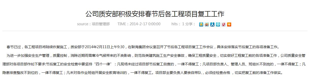 春節(jié)已過,各工程項目將陸續(xù)恢復施工,質安部于2014年2月11日上午9:30,在聯(lián)海集團會議室召開了節(jié)后各工程項目復工工作會議,具體安排落實節(jié)后復工的各項準備工作。 為進一步加強...