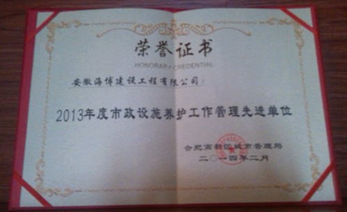 2014年4月,公司承攬的合肥市高新區(qū)市政養(yǎng)護工程,因表現(xiàn)優(yōu)異,被合肥市高新區(qū)城市管理局授予“2013年度市政設施養(yǎng)護工作管理先進單位”榮譽證書。 公司自2009年承攬合肥市高新區(qū)市...