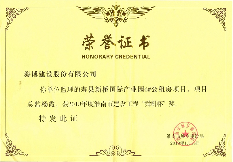 日前,淮南市城鄉(xiāng)建設(shè)局公布了2018年度淮南市建設(shè)工程優(yōu)質(zhì)工程獎(jiǎng)名單,我司承擔(dān)監(jiān)理的壽縣國(guó)際產(chǎn)業(yè)園6#公租房項(xiàng)目喜獲2018年度淮南市建設(shè)工程“舜耕杯”獎(jiǎng)。 該項(xiàng)目位于壽縣新橋國(guó)...