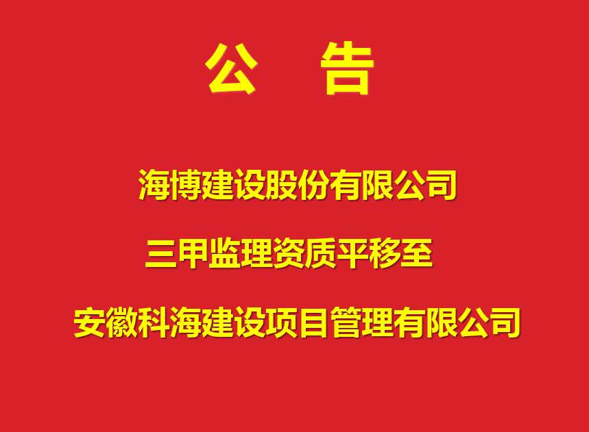 為推進(jìn)集團(tuán)公司工程建設(shè)組織方式改革,促進(jìn)我司持續(xù)健康發(fā)展。經(jīng)董事會(huì)研究決定,從能力培養(yǎng)、專業(yè)化培養(yǎng)的戰(zhàn)略部署角度出發(fā),將海博建設(shè)股份有限公司資質(zhì)類別中的監(jiān)理資質(zhì)平移至安徽科海建設(shè)項(xiàng)目管理....