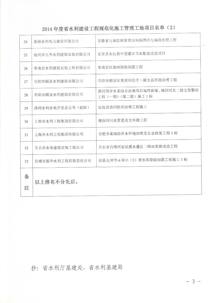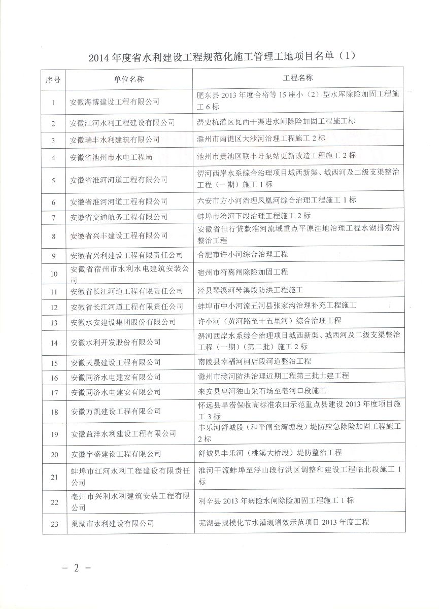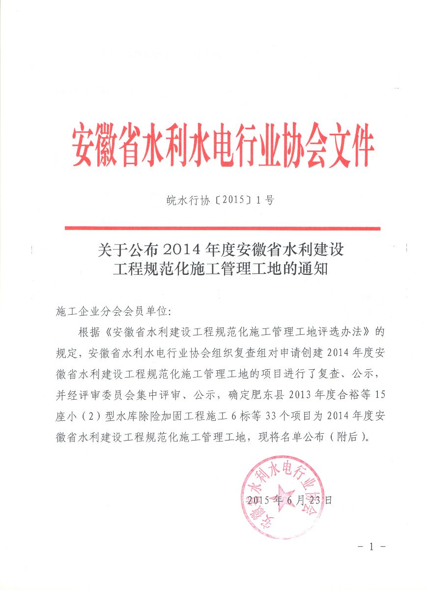 我公司承建的“肥東縣2013年度合裕等15座省級?。ǘ┬退畮斐U加固工程6標”獲得 2014年度“安徽省水利建設(shè)工程規(guī)范化管理工地”的榮譽稱號。