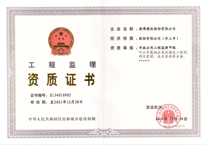 2016年12月28日,正值元旦佳節(jié)之際,我公司申報(bào)的“市政公用工程監(jiān)理甲級(jí)資質(zhì)”獲批,至此,我公司已擁有市政公用工程施工總承包壹級(jí)、水利水電工程監(jiān)理甲級(jí)、市政公用工程監(jiān)理甲級(jí)三項(xiàng)國(guó)家級(jí)資質(zhì)。