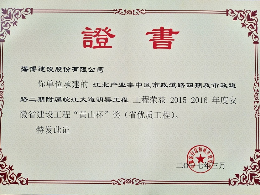 近期,我公司承建的江北產(chǎn)業(yè)集中區(qū)市政道路四期及市政道路二期附屬皖江大道明渠工程,喜獲2015-2016年度安徽省建設(shè)工程“黃山杯”榮譽。該工程位于蕪湖市鳩江區(qū)江北產(chǎn)業(yè)集中區(qū)起步區(qū)內(nèi),路線全長約9.4km,呈“井”字形布局,路面寬度24~32m,設(shè)計車速40km/h,新建瀝青混凝土路面,工程總造價約1.47億元。2014年3月,榮獲江北產(chǎn)業(yè)集中區(qū)“安全生產(chǎn)工作先進單位”稱號。2016年1月,獲得2015年度蕪湖市建設(shè)工程“鳩茲杯”獎,全面實現(xiàn)了工程質(zhì)量目標。