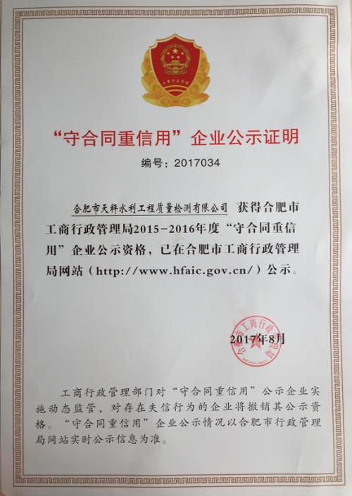 近日,合肥市工商行政管理局頒發(fā)了市級守合同重信用公示證書,合肥市天秤水利工程質(zhì)量檢測有限公司首次申報(bào)并獲得此項(xiàng)殊榮。