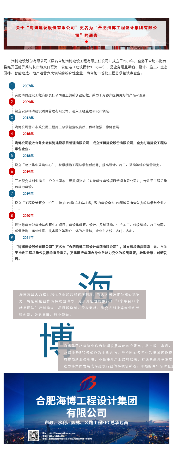 關(guān)于“海博建設(shè)股份有限公司”更名為“合肥海博工程設(shè)計集團有限公司”的通告